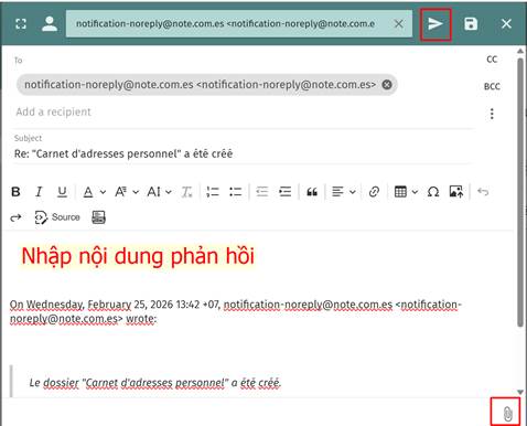 Bước 2: Nhập nội dung phản hồi. Có thể đính kèm file hoặc chỉnh sửa nội dung (icon ghim giấy). Sau đó nhấn gửi email (icon máy bay giấy).