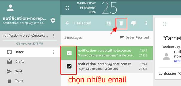 Xóa nhiều email cùng lúc: Chọn nhiều mail và bấm vào biểu tượng thùng rác ngay góc trên